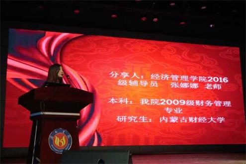5月1日晚,bwin必赢在学苑会堂召开考研经验分享会。2013级员工代表蒋连杰、高黎、孙悦等8人分享了考研经验,2014、2015、2016级全体本科辅导员、班主任及本科员工参加了此次会议,会议由bwin必赢副经理王春晖主持。