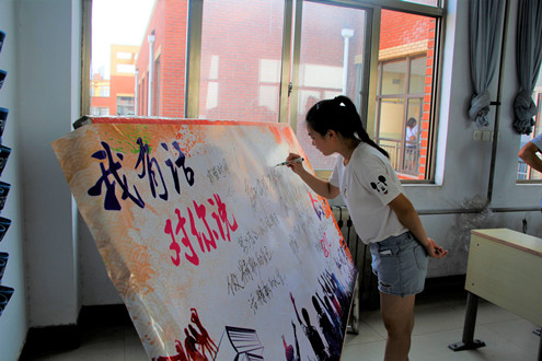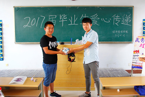 活动开始,苏成荣老师向参与本次毕业爱心传递活动的毕业生表示衷心的感谢。随后由毕业生代表捐赠物品并登记在册,在校员工代表接受馈赠并表示感谢。随后全体毕业生代表在留言板上留言。大学四年是满满的回忆录,更是一部青春的奋斗史。小小的留言板承载着他们对未来的希望以及对学弟学妹们的寄托。接着,苏老师对2017届毕业生表示祝愿,希望他们在未来可以发挥个人潜能,走的更高,看的更远。