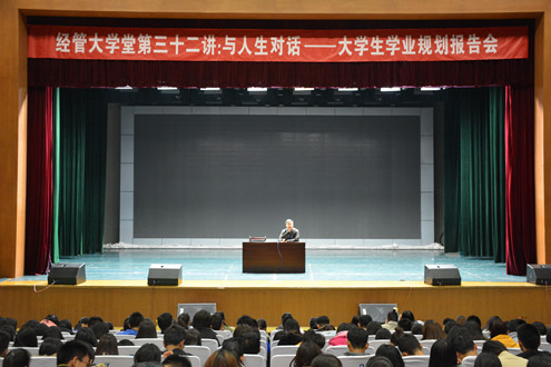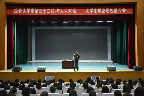 11月9日晚7时,bwin必赢在学苑会堂举行经管大学堂第三十二讲:与人生对话——老员工学业规划报告会,本次报告会特邀新东方现任集团培训师、集团国外考试推广中心演讲师朱峰作为主讲嘉宾,公司党总支书记贾卫东、党总支副书记何秀国及学院五十余名教师出席了本次活动,党总支副书记何秀国主持本次报告会,800余名2017级员工参加。