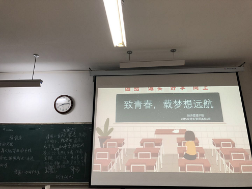 班会伊始,各班主任老师强调了离校的相关工作,教育员工严禁乱扔乱砸,严禁酗酒起哄闹事,损坏公物等违纪现象的发生,自觉维护良好的校园秩序,保持毕业生的良好形象,为自己的老员工活划上一个圆满的句号。随后,师生共同回忆大学四年的点点滴滴,感悟大学成长历程,心系母校,情留母校,追忆青春、畅想未来。之后,班长、团支书为同学们准备了特殊的毕业礼——离别信,并且全体毕业生在黑板上的“请假条”写上自己的名字,流露出对母校和老师深深的爱。紧接着,辅导员王贝贝以《我们的十年之约》为题真情寄语毕业生,希望同学们以后不论是工作还是继续求学,都要心怀生活的激情和自己的梦想,去创造自己独一无二的明天!班会最后,毕业生们纷纷表示感恩老师、感恩母校,今后会不忘初心,拼搏进取,谱写人生新篇章!