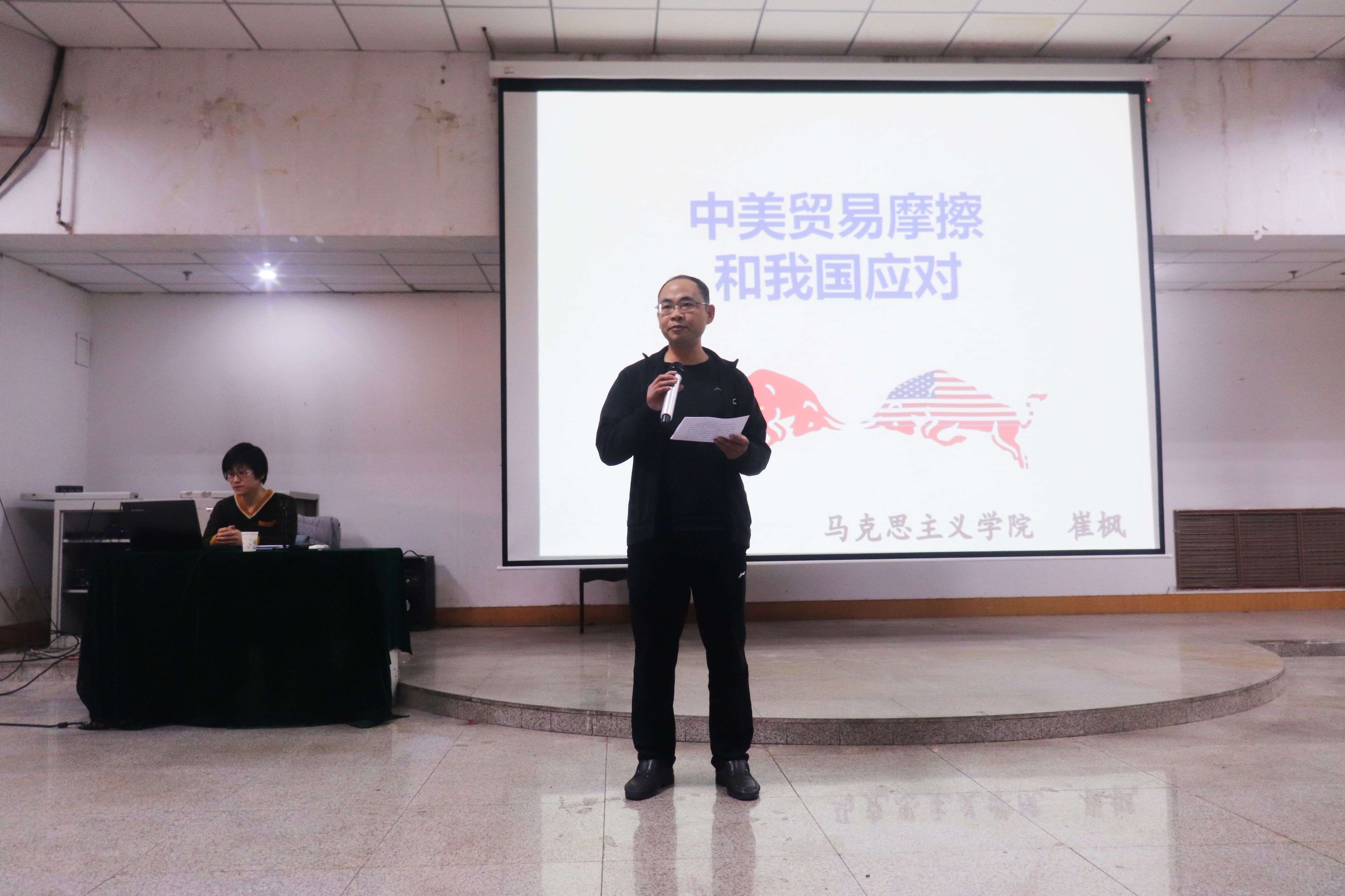 11月12日下午,马克思主义学院崔枫老师应邀在学校图书馆307报告厅为bwin必赢全体教职工、员工党员作了《中美贸易摩擦和我国应对》专题报告。报告会由公司党总支副书记何秀国主持。