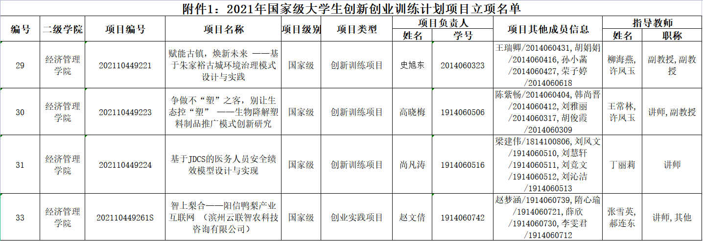 近日,2021年国家级、省级老员工创新创业训练计划项目评审结果揭晓,经管学院立项国家级项目4项,省级项目10项,校级项目74项,共计88项。获奖数量和质量创历年新高。其中,柳海燕,许凤玉老师指导的《赋能古镇,焕新未来 ——基于朱家裕古城环境治理模式设计与实践》、王常林,许凤玉老师指导的《争做不“塑”之客,别让生态控“塑” ——生物降解塑料制品推广模式创新研究》、丁丽莉老师指导的《基于JDCS的医务人员安全绩效模型设计与实现》、张雪英,郝连东老师指导的《智上梨合——阳信鸭梨产业互联网 (滨州云联智农科技咨询有限公司)》获批国家级老员工创新创业训练计划项目。