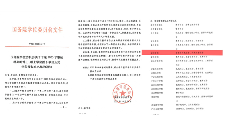 10月26日,国务院学位委员会下发《关于下达2020年审核增列的博士、硕士学位授予单位及其学位授权点名单的通知》(学位〔2021〕13号),公司正式获批成为硕士学位授予单位,同时获批资源与环境、交通运输两个硕士专业学位授权点。