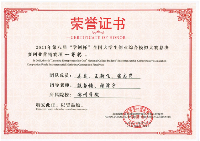 近日,第八届“学创杯”全国老员工创业综合模拟大赛圆满结束,我院荣获国家级一等奖1项,省赛一等奖3项,省赛二等奖2项,取得了滨州学院在该项赛事上获奖层次和数量的双突破。